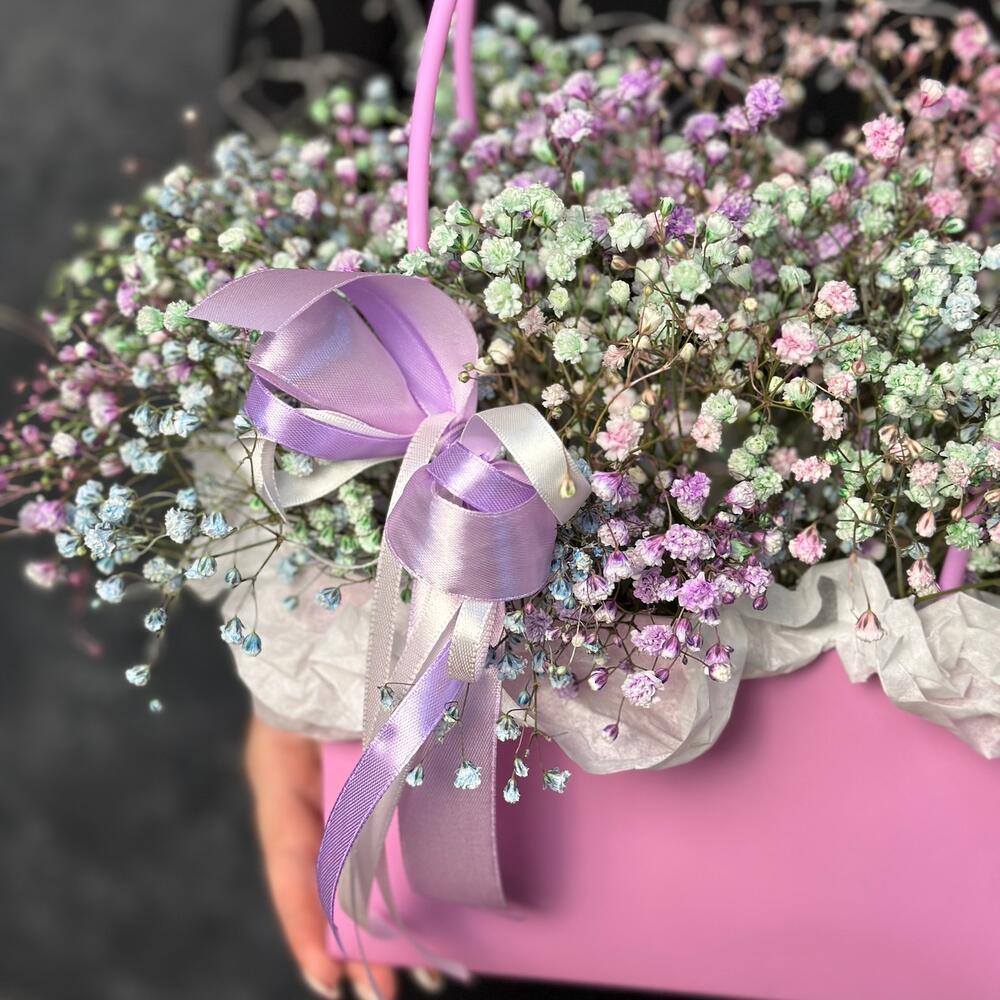 Тишью - 1 шт. Сумочка - 1 шт. Оазис флористический - 1 шт. бант атласный - 1 шт. гипсофила радужная - 5 шт.